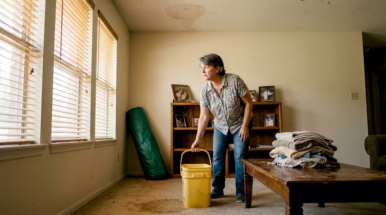 Your first job is to mitigate further damage from the inside. Place buckets under active drips, move valuables away from wet areas, and if you can safely access the exterior from a ladder, cover obvious breaches with a heavy-duty tarp. Secure the tarp with weights or boards, not nails, to avoid adding more holes. These steps matter because mitigation and documentation are the first things your insurer will ask about.